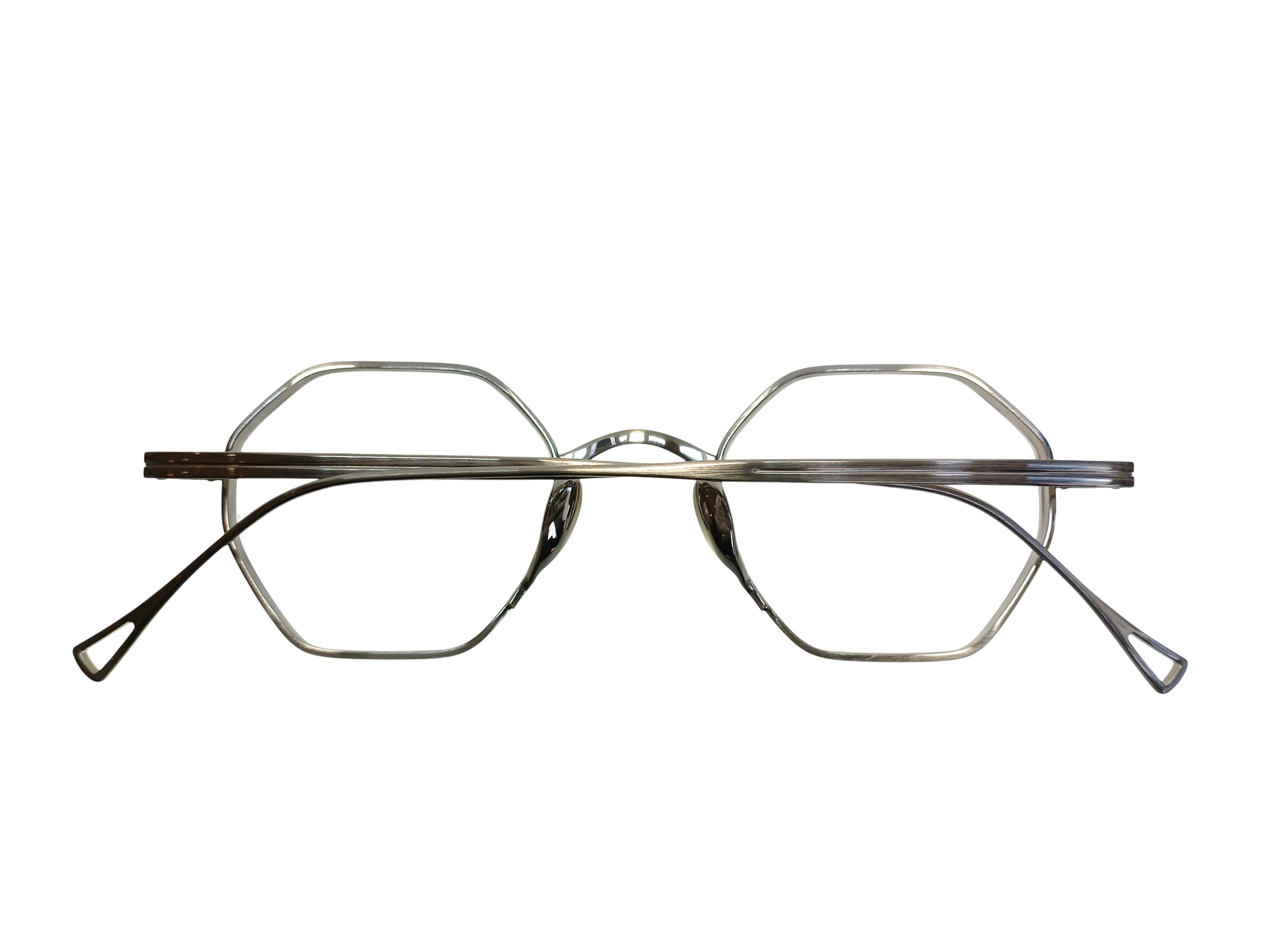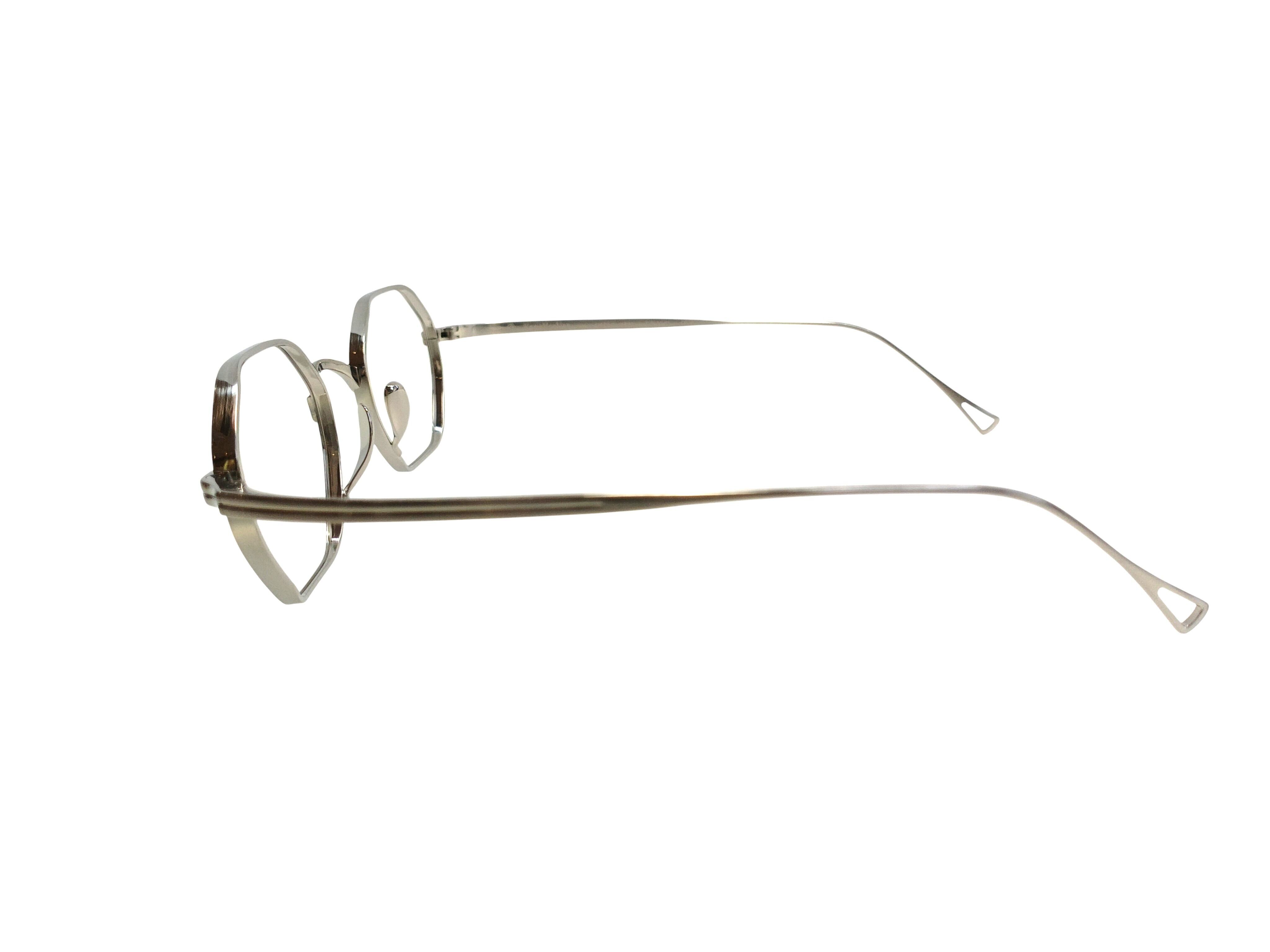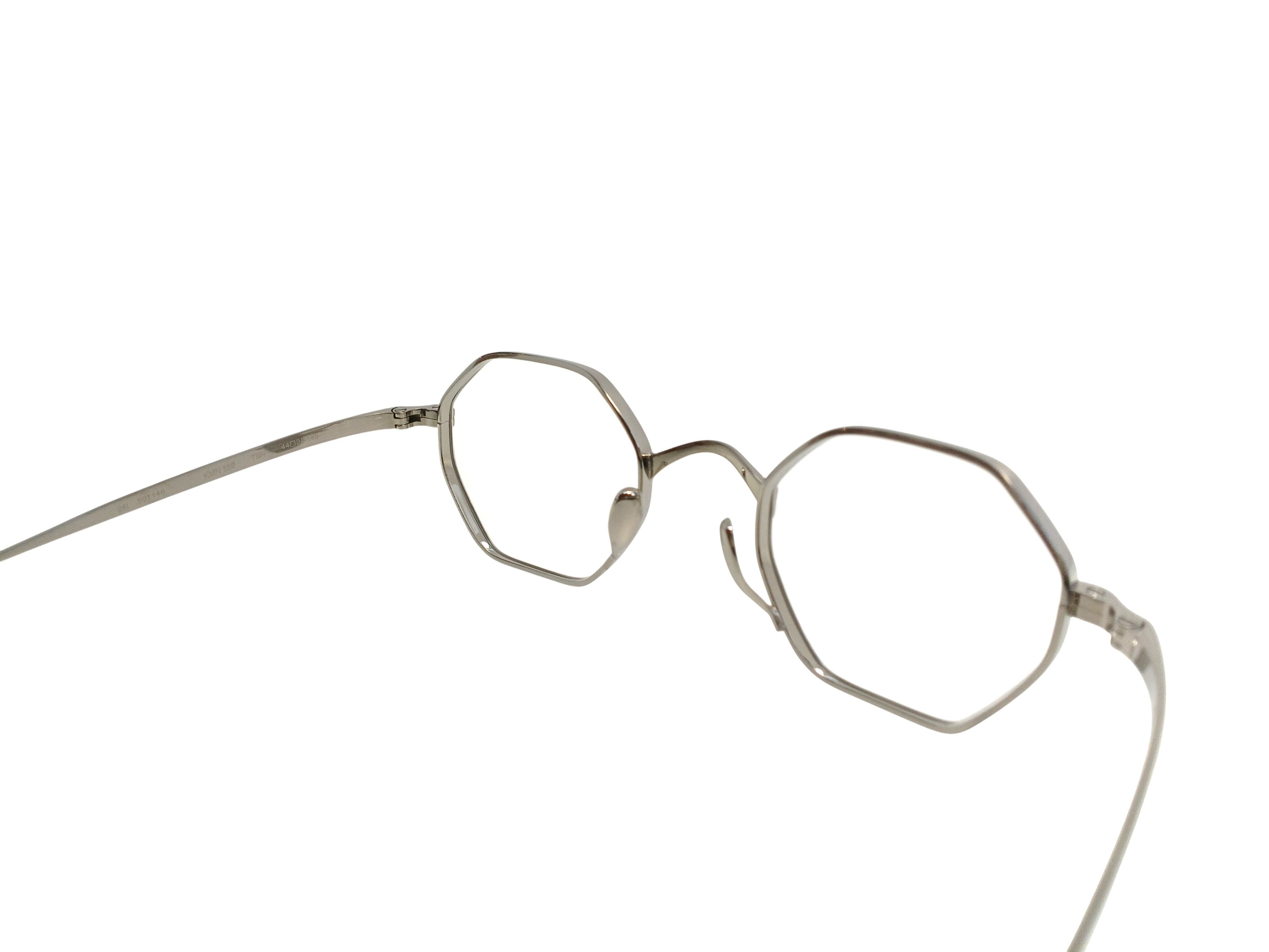 オクタゴンという幾何学的な造形に、カメマンネンの精緻な立体リム構造を組み合わせたモデル、KMN 152。 分厚いレンズをすっきりと収める設計思想のもと、リムには部分的に厚みと抑揚を加える高度な加工を施し、メタルフレームに奥行きと陰影を生み出しています。 極力目立たないよう設計されたパッドアームと鼻パッドにより、顔に掛けたときの印象は非常にすっきりと洗練された佇まいに。 直線的なラインと柔らかな丸みが共存するオクタゴンシェイプは、クラシックでありながらも、どこかモダンな空気を感じさせます。 造形美と実用性が美しく交差する、タイムレスなモデルです。