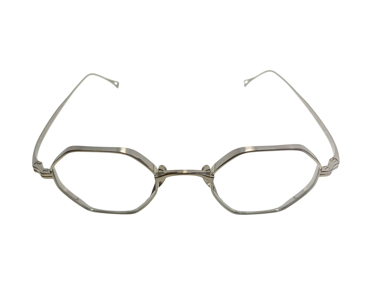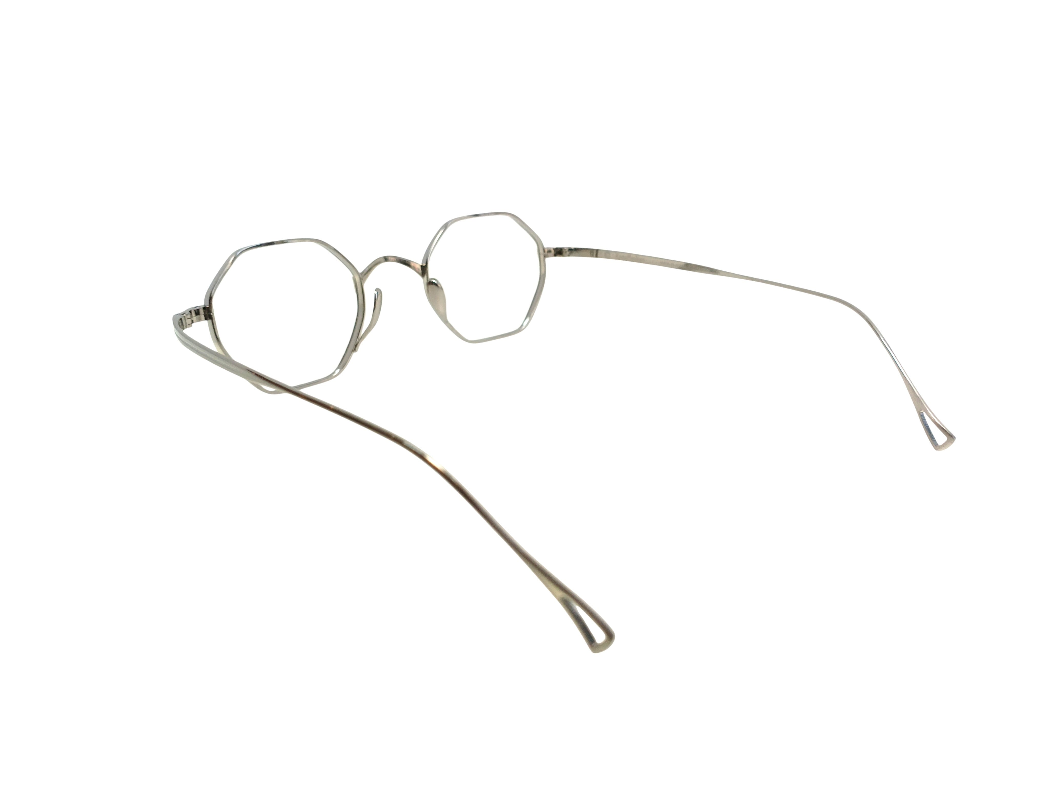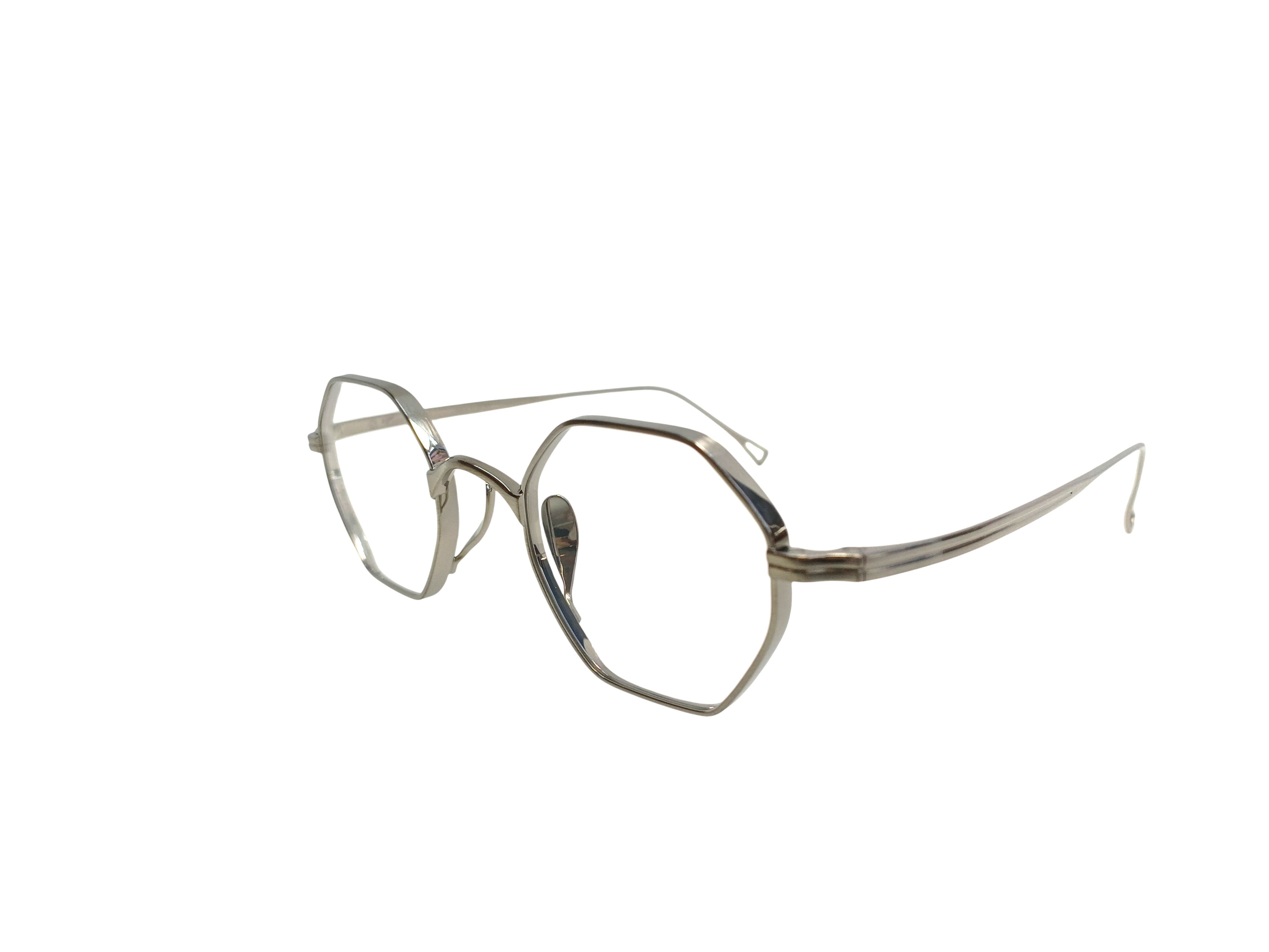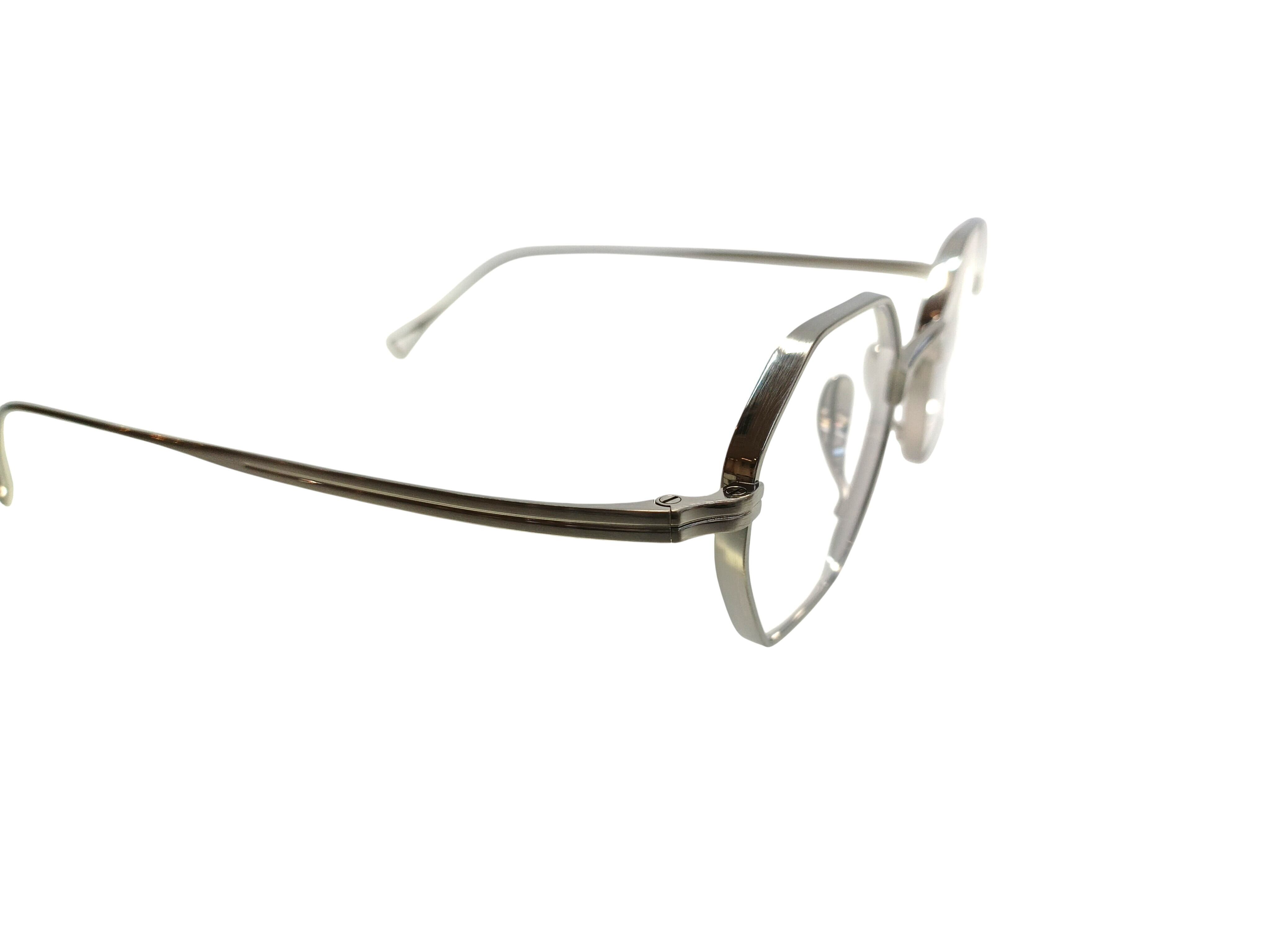 オクタゴンという幾何学的な造形に、カメマンネンの精緻な立体リム構造を組み合わせたモデル、KMN 152。 分厚いレンズをすっきりと収める設計思想のもと、リムには部分的に厚みと抑揚を加える高度な加工を施し、メタルフレームに奥行きと陰影を生み出しています。 極力目立たないよう設計されたパッドアームと鼻パッドにより、顔に掛けたときの印象は非常にすっきりと洗練された佇まいに。 直線的なラインと柔らかな丸みが共存するオクタゴンシェイプは、クラシックでありながらも、どこかモダンな空気を感じさせます。 造形美と実用性が美しく交差する、タイムレスなモデルです。