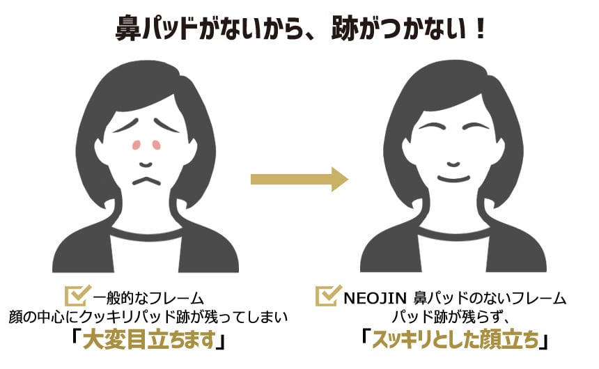 「鼻パッドの跡が残る」「鼻が低くてメガネが下がる」というユーザーの不満を解決するために開発したのが、
