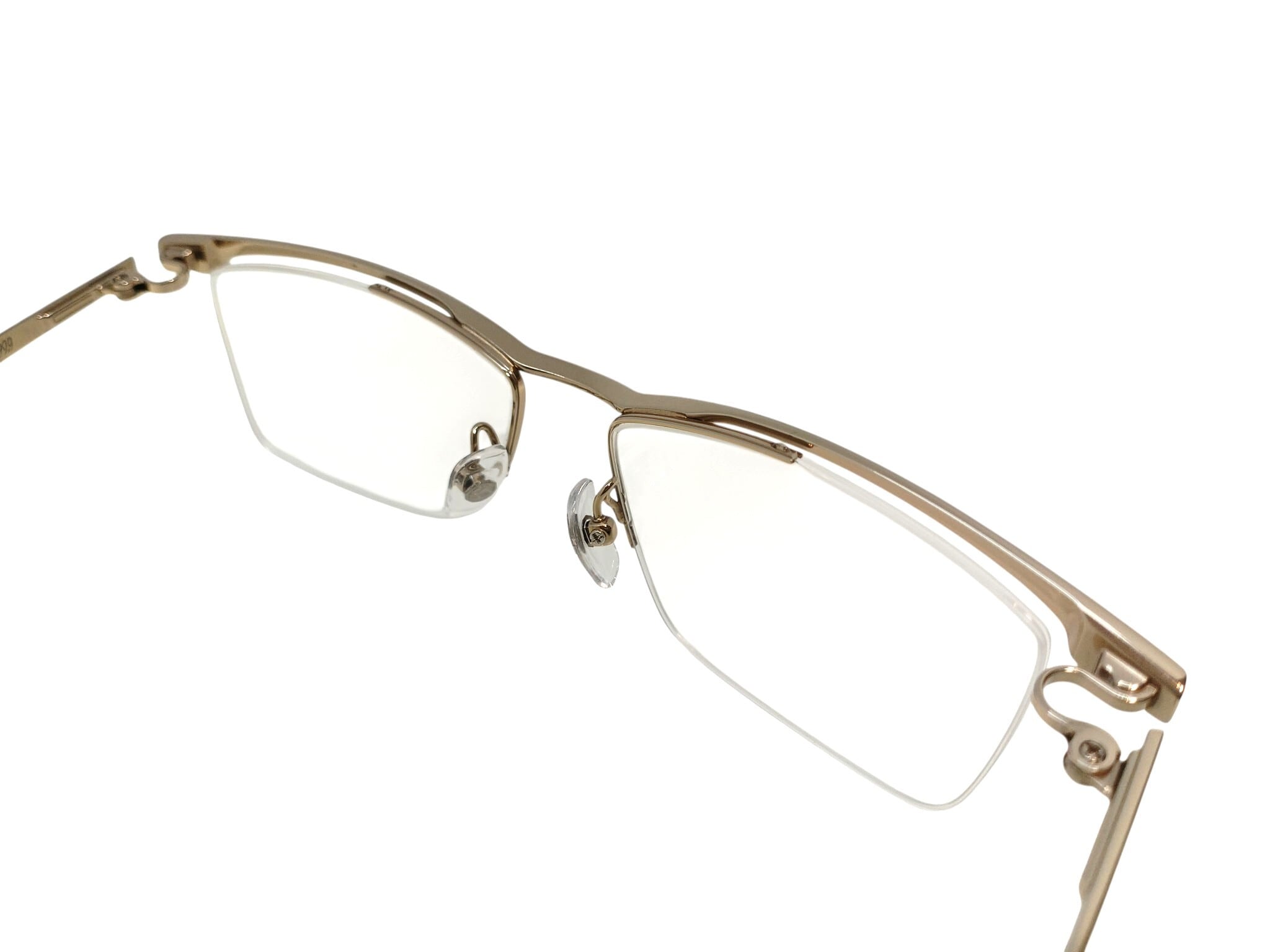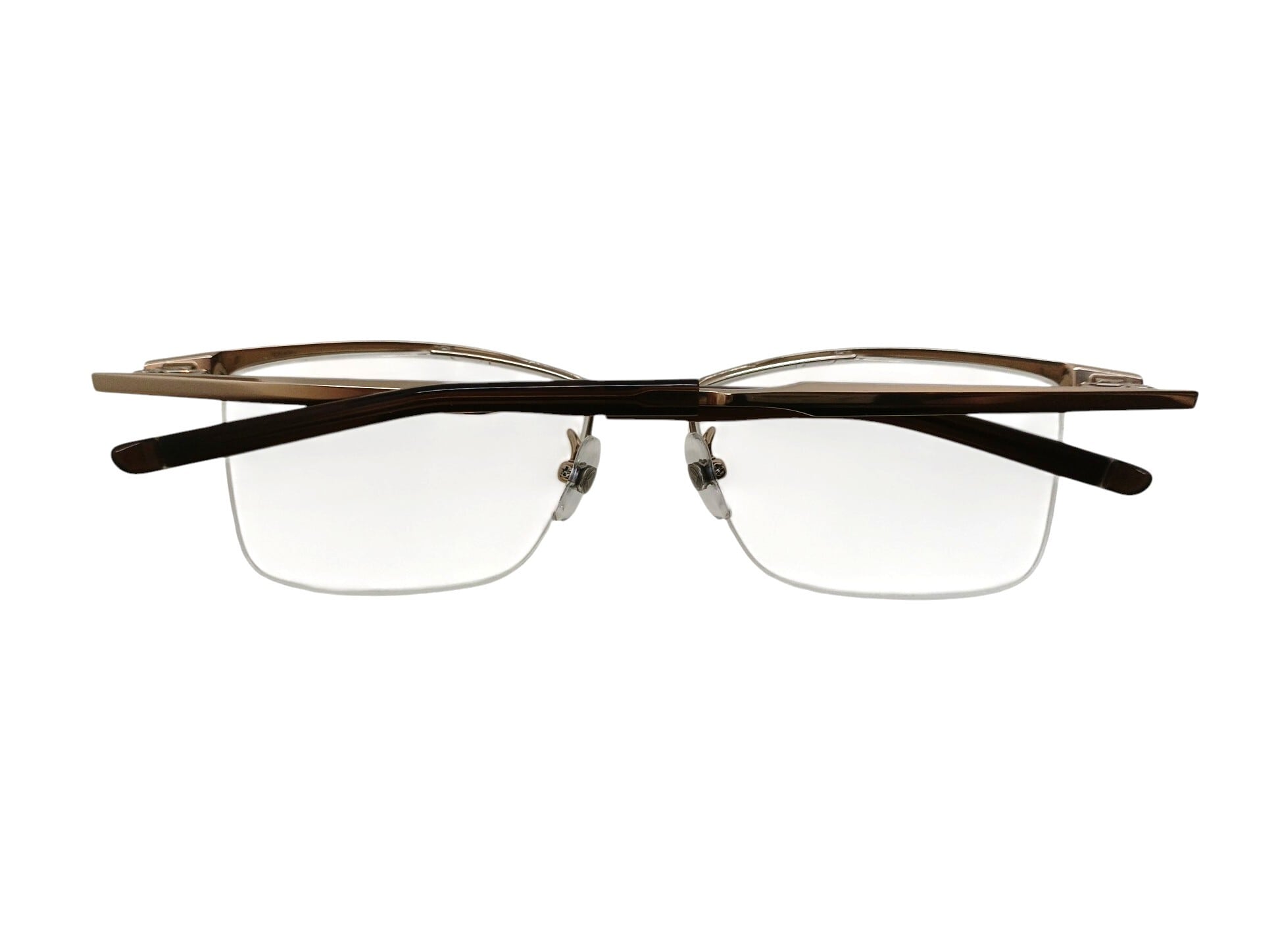 メタルブロウにおける王道のダブルフロント構造。フェイスフロントとインナーフロント、2つのフロント環境から、使用時におけるレンズへの負荷を防ぎます。ナイロールリムは、レンズを安定して固定できる環境下での最小限の長さに設定することで、度付きレンズへの対応力を高めています。